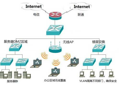 整個網(wǎng)絡(luò)交換的集中點和核心部分是銳捷的RG12000型核心路由,可拓展的大型核心路由。具備光電轉(zhuǎn)換能力。大樓內(nèi)部所有樓層、分支交換機都通過光纖與之連接。